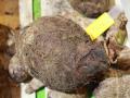 The taro (Colocasia esculenta (L.) Schott) is an herbaceous perennial, mostly cultivated as an annual. It grows up to a height of 2 m. Its adventicious and shallow root system arises from the corm, a swollen underground stem that contains high levels of fine starch and weighs up to 1 kg. Corms are usually cylindrical and 30 cm long x 15 cm diameter, but they are highly variable in size, shape and colour. The leaves are 30-90 cm long and 20-60 cm broad, and are borne in crowns at the end of upright, thick, succulent, 0.9-2 m high petioles. The inflorescence is a large pale green spathe (Ecoport, 2010; Safo Kantaka, 2004).