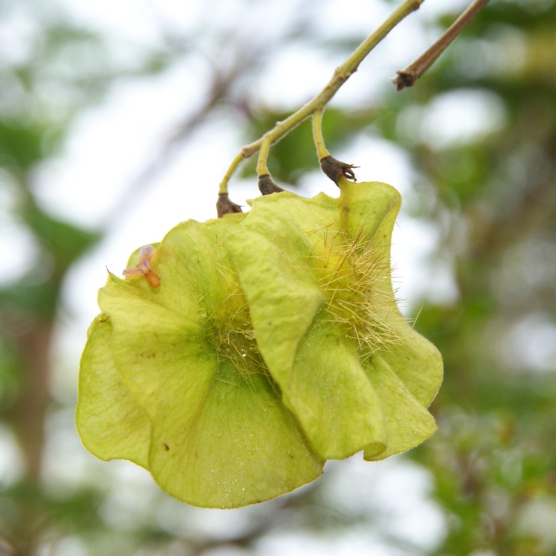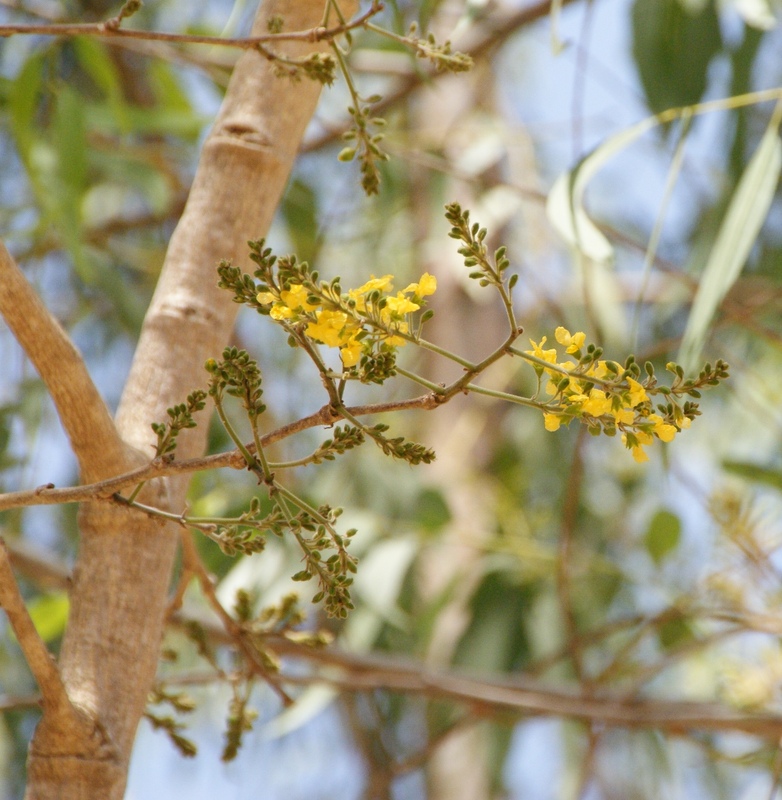 Pterocarpus erinaceus is a medium-sized tree up to 15 (-25) m in height with a rounded, open crown. The branches have long shoots that bend downwards. In good conditions, barwood has a straight, cylindrical and branchless bole up to 10 m in height. Under poorer conditions, the bole is often twisted, fluted and low-branched. The trunk can be up to 75 (-100) cm in diameter, slightly buttressed. The bark surface is greyish brown to blackish in colour, fissured and scaly. The inner bark is yellowish brown, with reddish streaks, and it exudes a reddish translucent gum on slashing. The twigs are densely hairy when young. The leaves are alternate, imparipinnately compound with (5-) 7- 11(-15) leaflets. The leaves are borne on 3–7 cm long petioles, with hairy pinnae, (7-) 10-17 (-22) cm long. The leaflets are thick-papery, usually alternate, veined, hairy when young, ovate to elliptical in shape, (4-) 6-11 cm long × (2-) 3-6 cm broad, and brownish in colour. The inflorescence is an axillary or terminal panicle 7–20 cm long. The flowers are bisexual, golden yellow in colour, papilionaceous, in shape with a standard almost circular, up to 15 mm × 13 mm, wings up to 13 mm long, and keel up to 10 mm long. The fruit is a straw-coloured, circular, flattened, indehiscent, 1-2 seeded pod, 4–7 cm in diameter. The pod has a papery, finely veined wing with wavy or plaited margin. The seed-containing portion bears prickles. The seeds are smooth, reniform, flat to slightly thickened, 10 mm long× 5 mm wide, red to dark brown in colour (Duvall, 2008). The Pterocarpus genus is named after its winged ("pteros") fruit ("carpos") (Orwa et al., 2009).